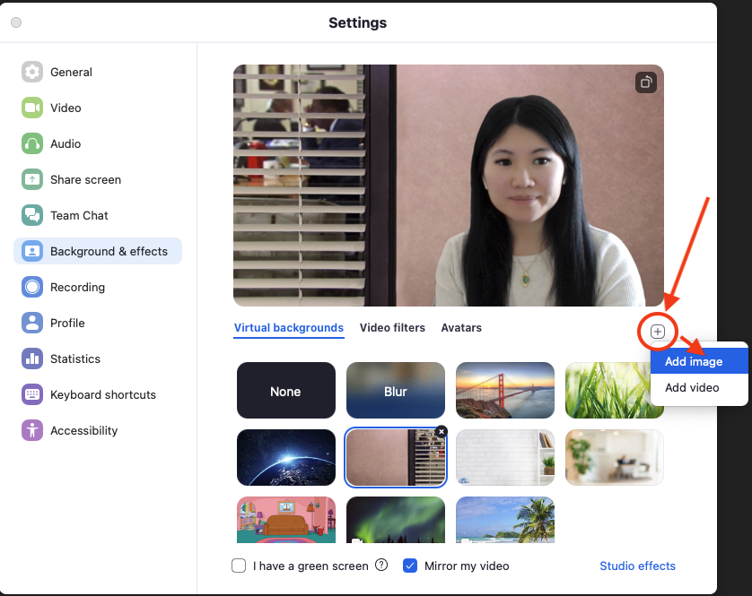 2. This will bring you straight to the "Background & effects" section of the Settings. Here you will be able to select "Add image" to upload one from your device.