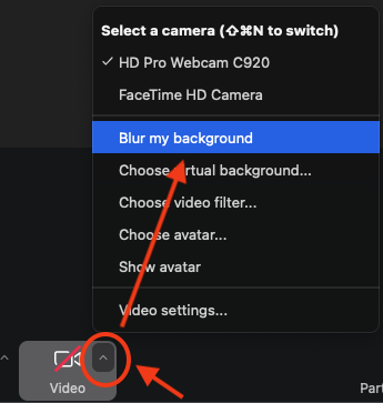 1. While in a Zoom meeting, click the upward arrow on the Video icon and select "Blur Virtual Background"